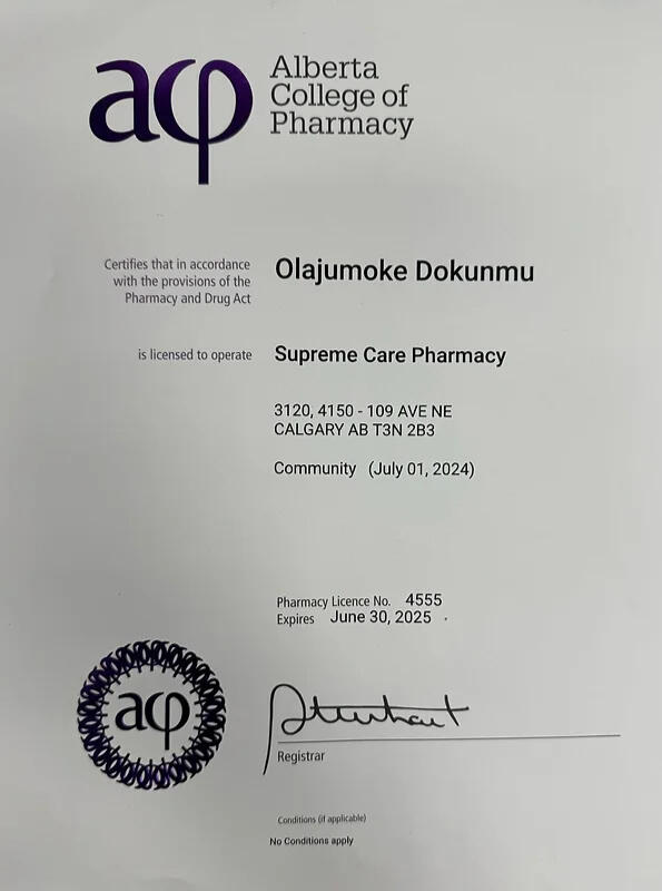 Supreme Care Pharmacy is licensed under the Alberta College of Pharmacy.The licensee is required to provide, on the request of a patient, the name and practice permit number of any regulated member who provides a pharmacy service to the patient or who engages in the practice of pharmacy with respect to a patient.Patients who have concerns about the pharmacy services they receive are encouraged to discuss the problem directly with the pharmacist.
